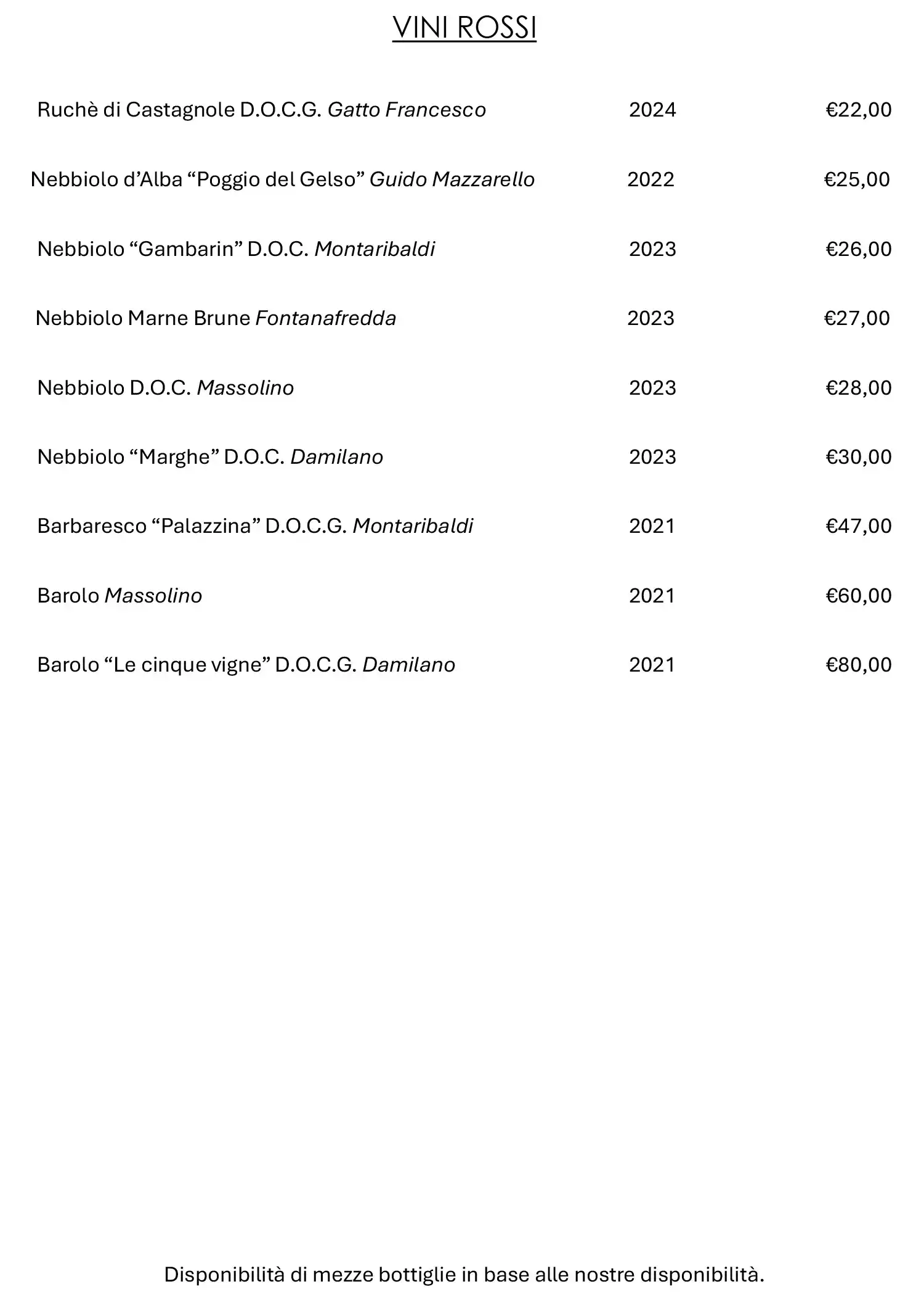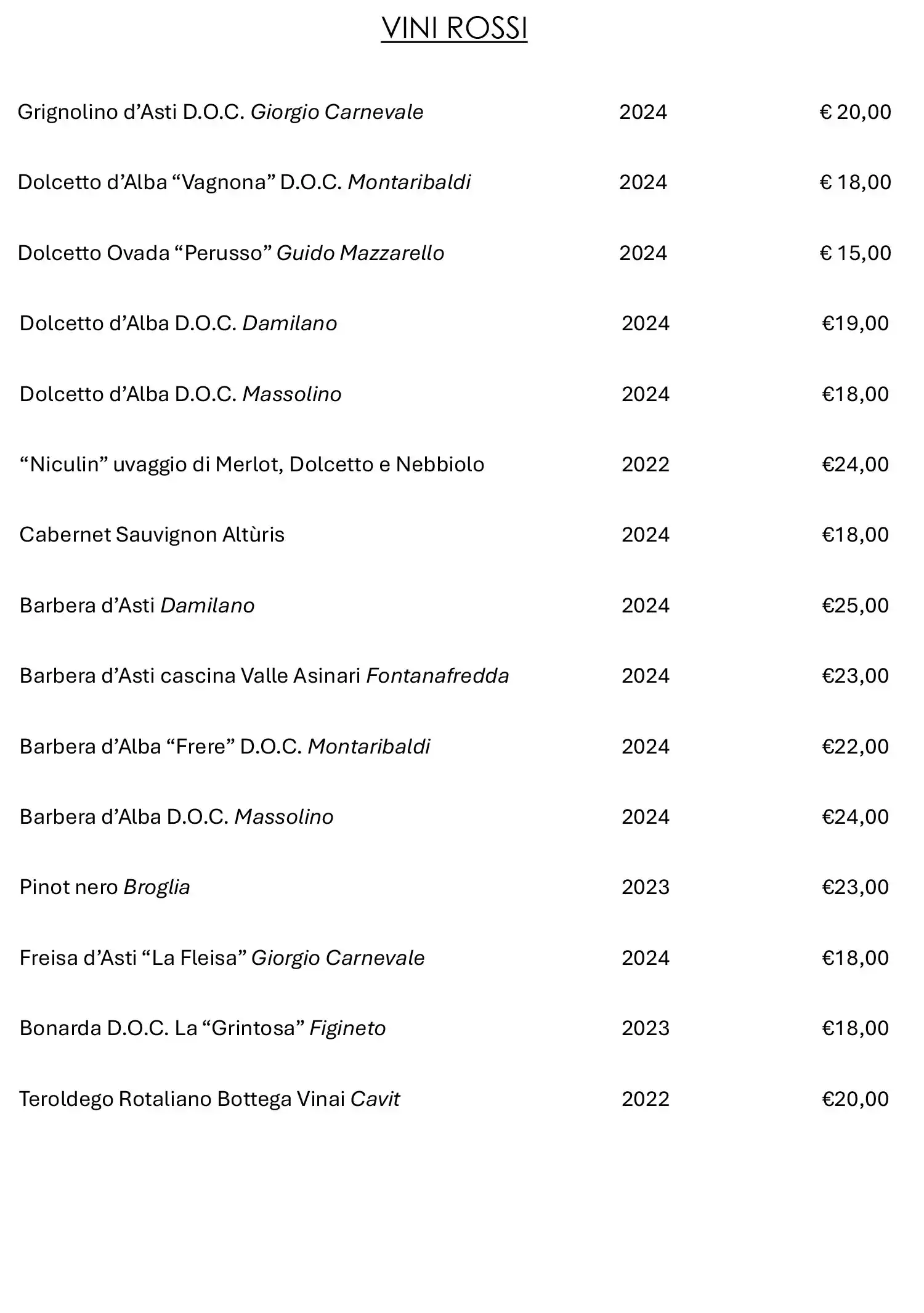 Il nostro personale sarà felice di illustrarti tutte le caratteristiche dei vini messi a disposizione, consigliandoti gli accostamenti più appropriati. Se desideri richiedere maggiori informazioni, non esitare a metterti in contatto con lo staff dell’Osteria.